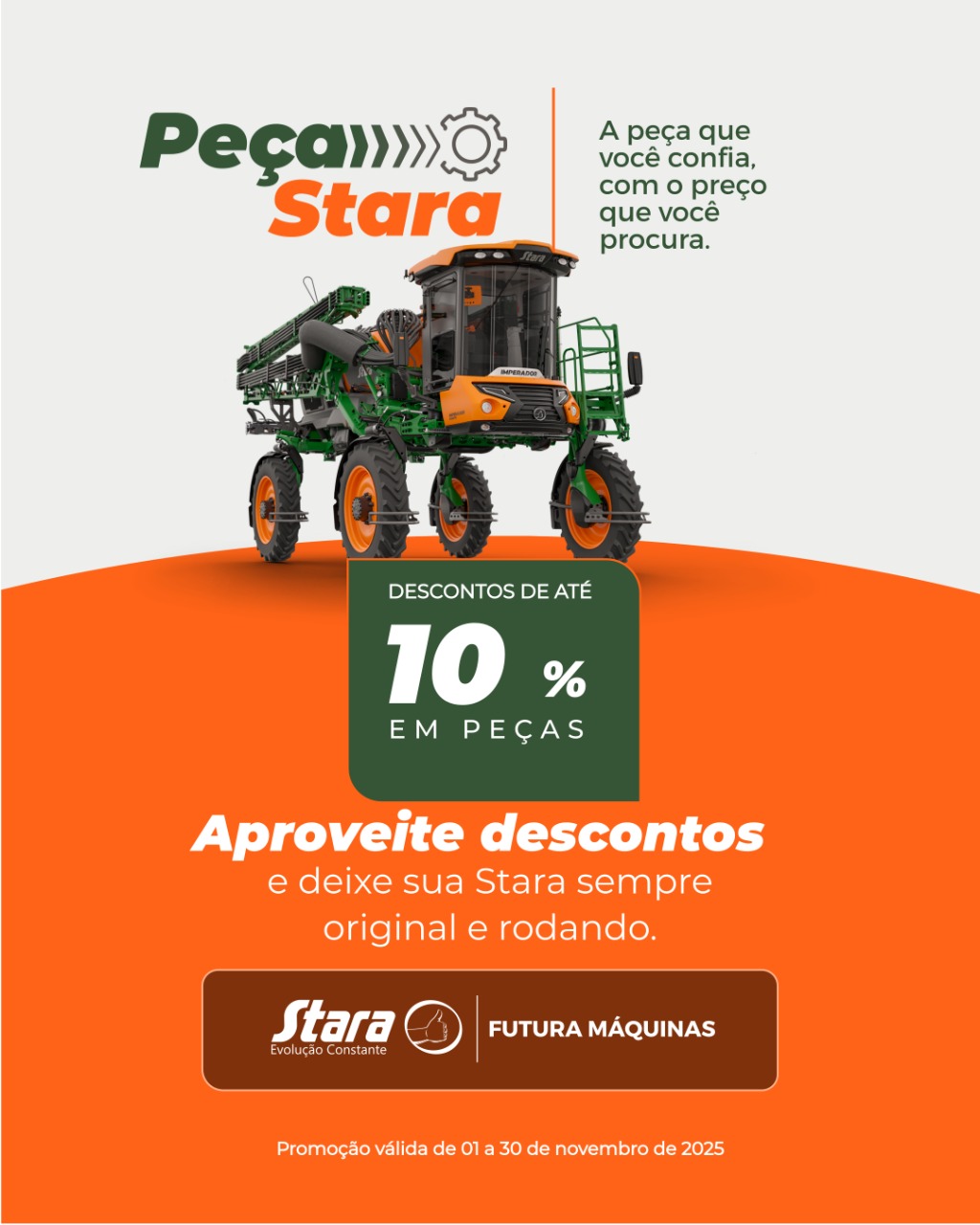 Aproveite o mês de novembro com ofertas exclusivas em peças originais para plantadeiras e pulverizadores Stara na Futura Máquinas. Garanta o melhor desempenho do seu equipamento com qualidade, rendimento e atendimento especializado.
